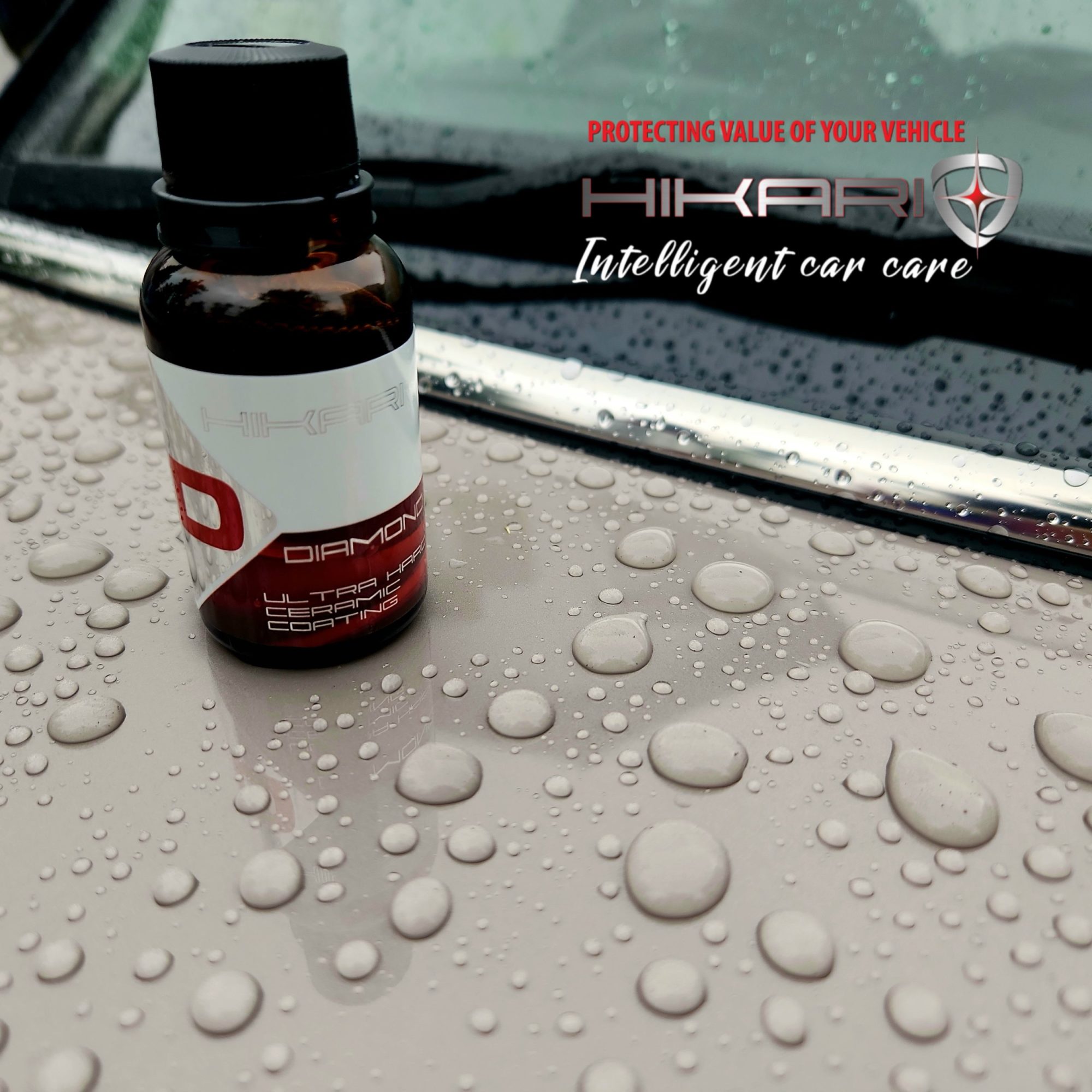 HIKARI DIAMOND の親水性で汚れもまとめて弾き飛ばすので、雨上がりに拭き上げだけすれば、新品のような輝きを維持します。