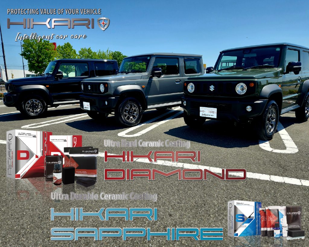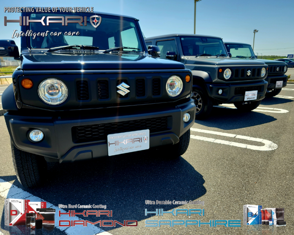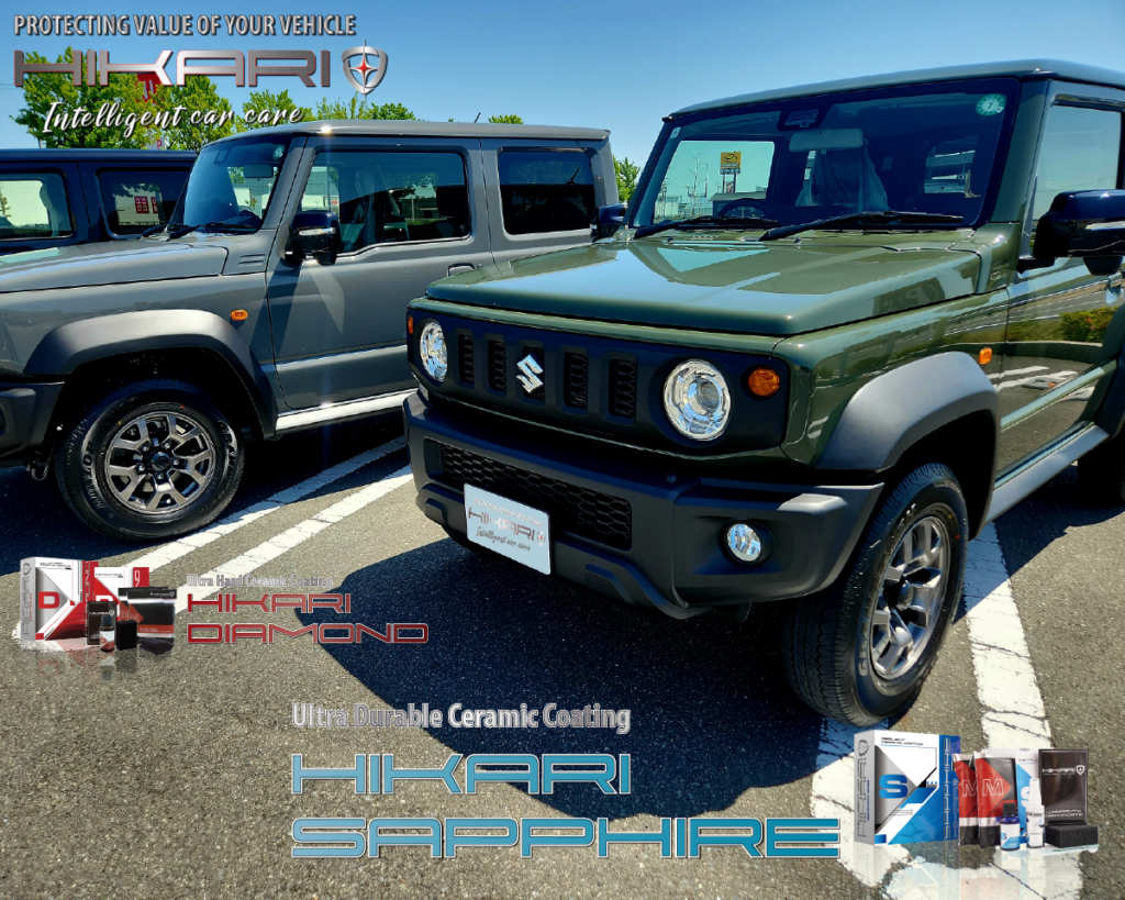 伝統の悪路走破性と先進の安全装備を搭載したジムニー シエラにはHIKARI DIAMONDとSAPPHIREを塗布。