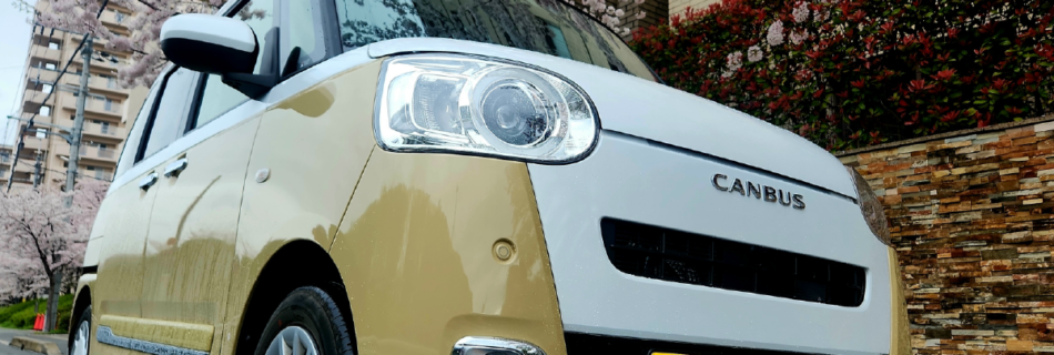 雨ふりしきる中桜とHIKARIコーティング車で風情ある見栄えを。 HIKARI SAPPHIRE施工されたDAIHATSUのCANVASでお花見です。 光輝く高級感ある光沢が曇天の暗さ、白色のボディ関係なく …
