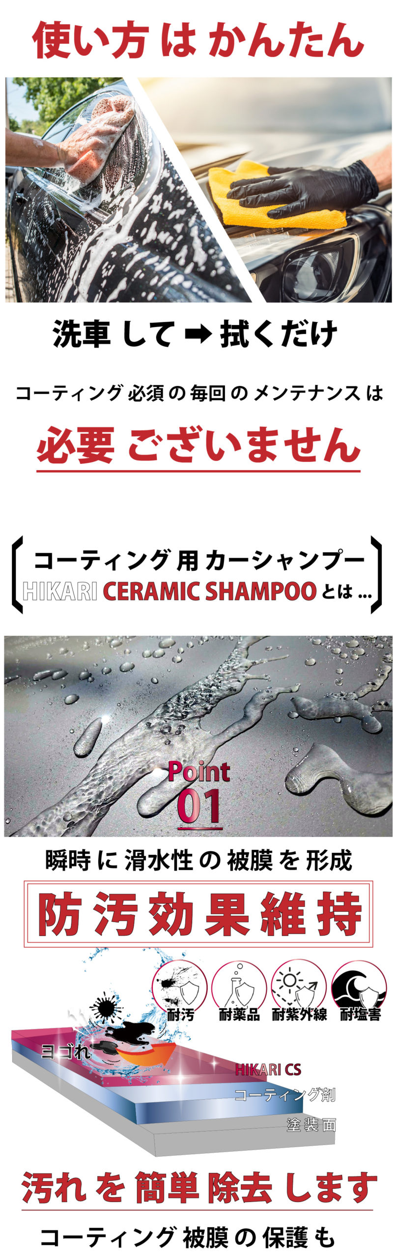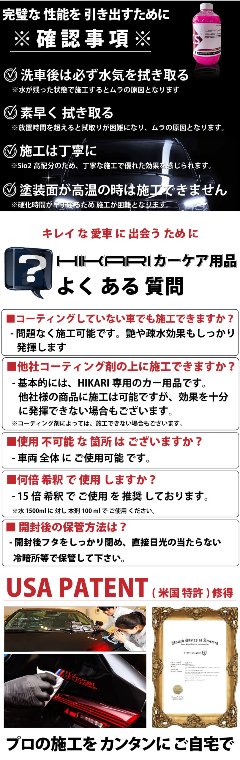- 簡単な使用方法:洗車とコーティングのメンテンナンスが同時に行えるので、大幅に時間短縮できます。