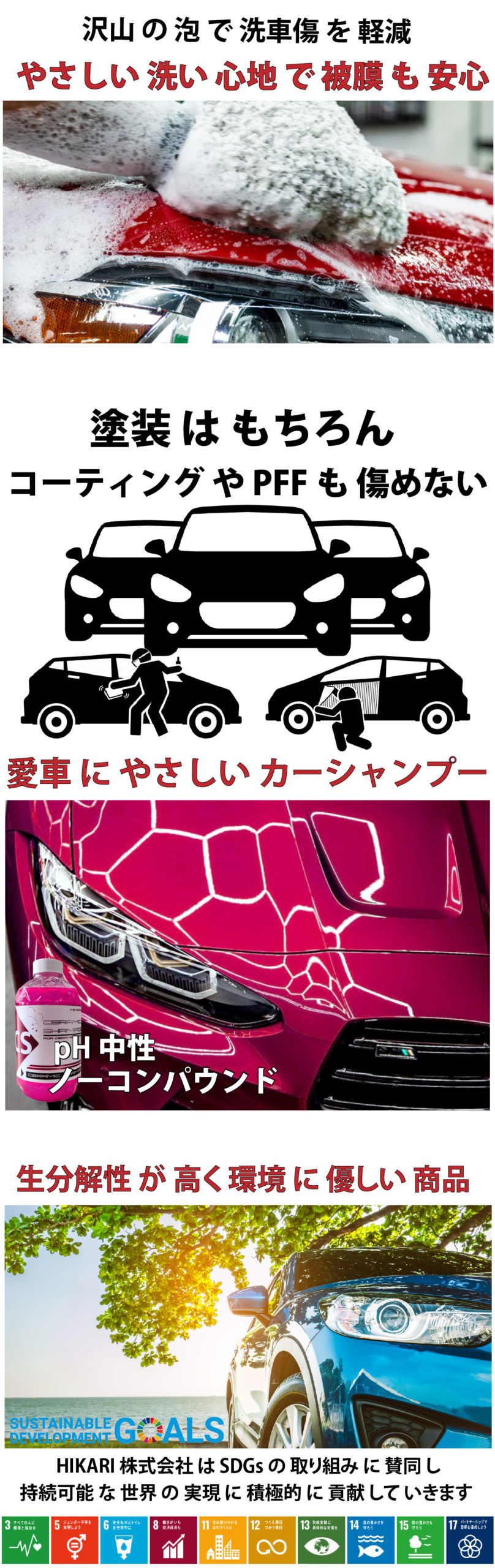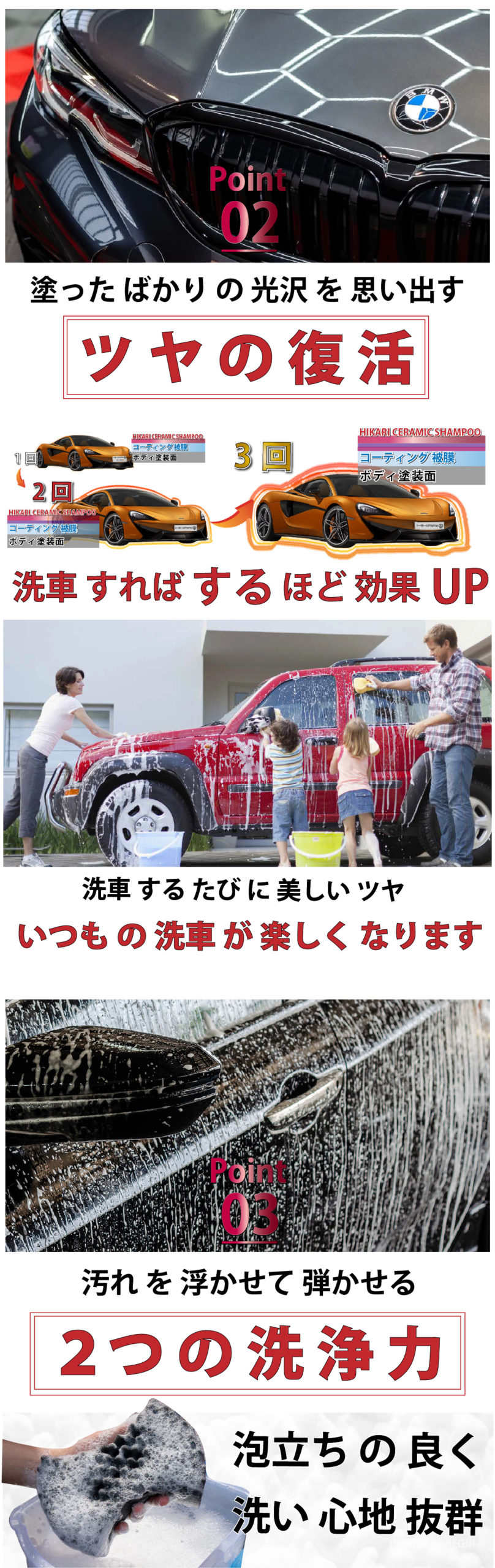 - 高光沢仕上げ:洗車するだけで車のボディが光沢感あふれる仕上がりに。