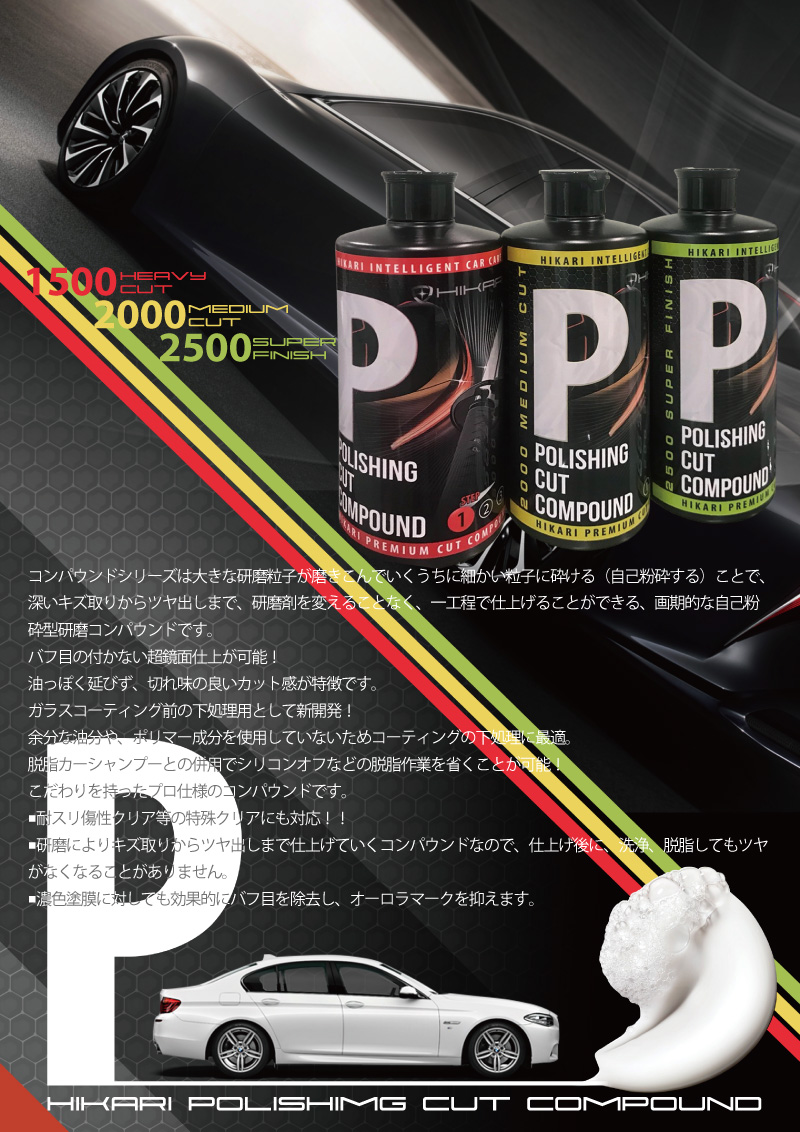 コンパウンドシリーズは大きな研磨粒子が磨きこんでいくうちに細かい粒子に砕ける(自己粉砕する) ことで、深いキズ取りからツヤ出しまで、研磨剤を変えることなく、一工程で仕上げることができる、画期的な自己粉砕型研磨コンパウンドです。