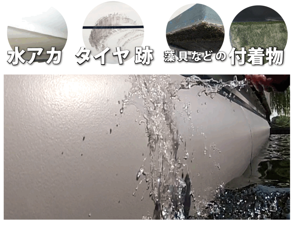 また長期間汚れを放置したとき、藻や貝などの付着物やタイヤ痕などの落としづらい汚れがついたときは、水洗いのみでも難しい場合がございます。