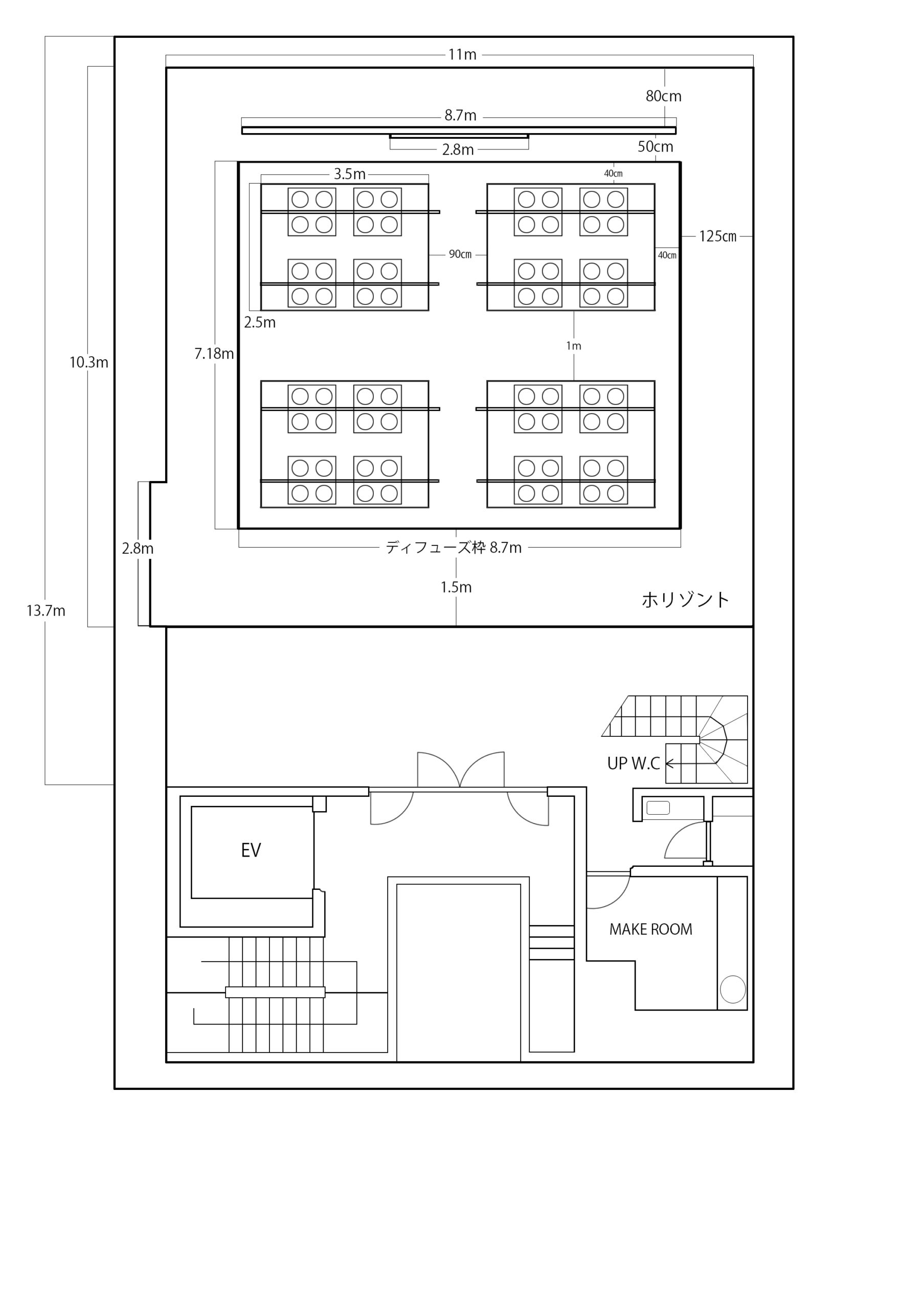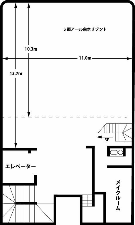 HIKARI-STUDIO 2 sTUDIO2 2F 天井高7.6m・ライト下高4.4m.3面アールホリゾント約110㎡のスタジオです。3面アールホリ特有の奥行き感や光回りの良さを活かしたイメージ撮影にオススメです。 スタジオ情報 平面図 電動スカイライト(16灯/ストロボ配線可能) 電動ディフューズ枠(7.18m/全面ディフューズ可能) 電動バトン 天井高7.6m ライト下高4.4m 斜俯瞰撮影可能(約4m) メイクルーム 流し台 冷蔵庫 有線放送 無料無線LAN 長机 2台 椅子 8脚 全体45坪(ホリゾント35坪)
